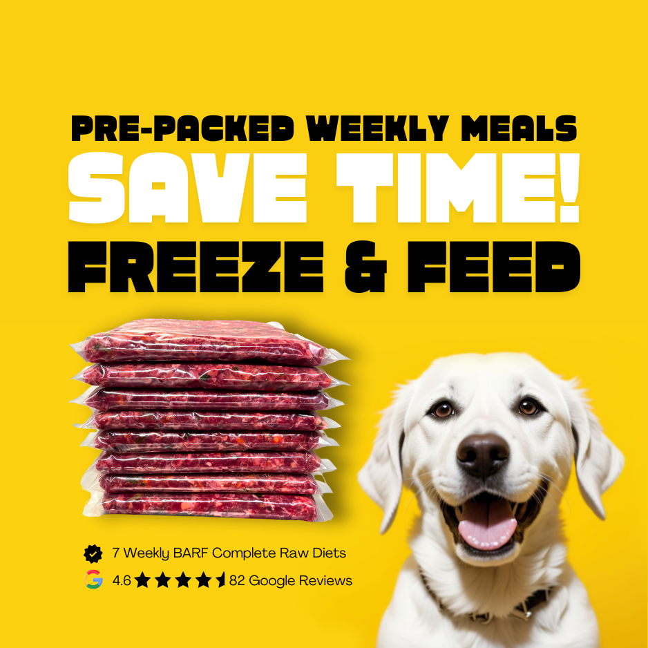 Our weekly raw box comes with 7 x 1kg pre-packed meals ready for the freezer & feeding.