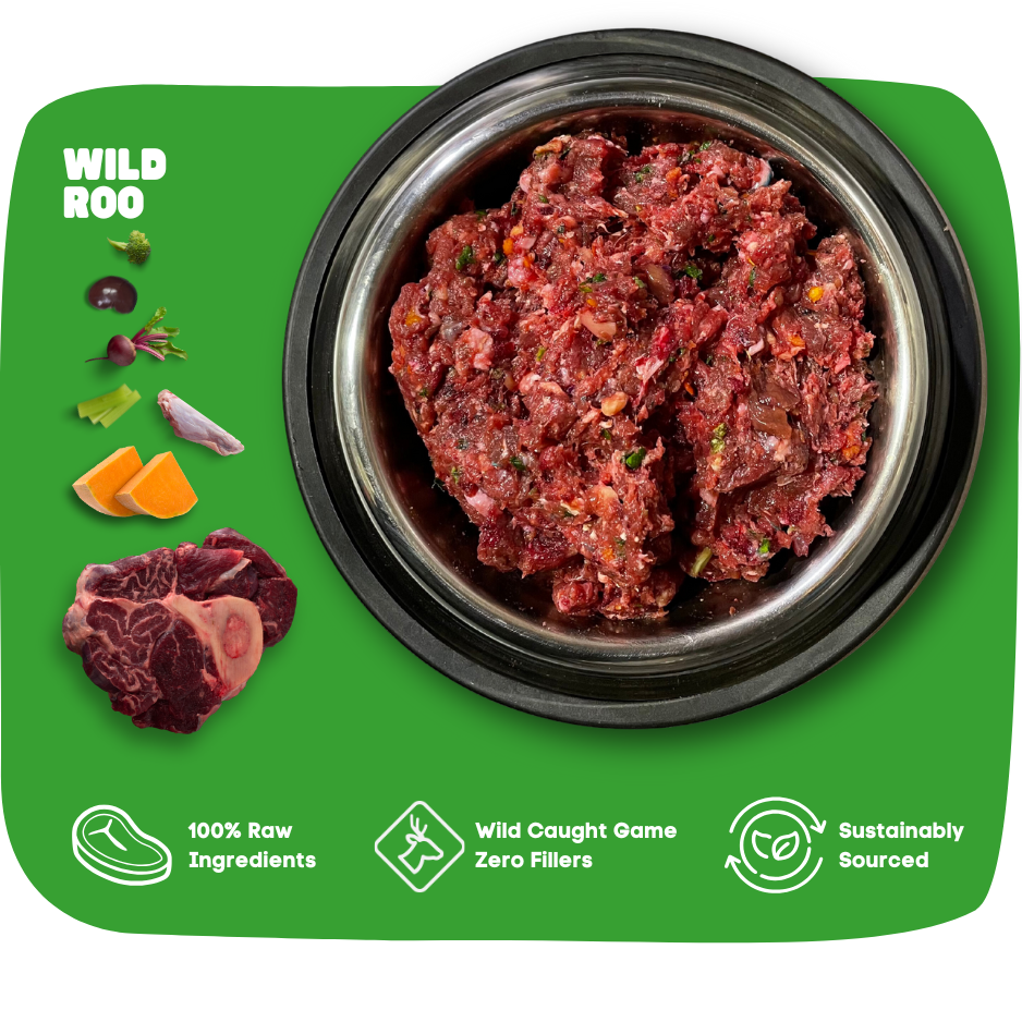 Made of 73% lean kangaroo, 10% edible raw bone, 10% secreting organs, 7% fruit, veg & superfoods.